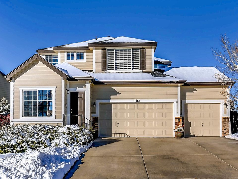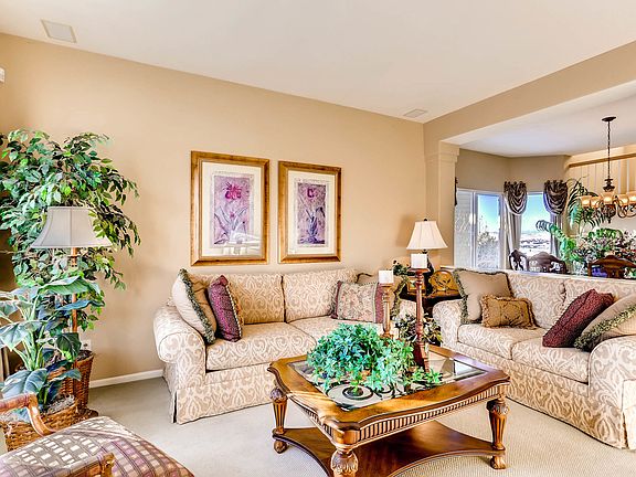 Beautiful 2 story home in great Parker community with AMAZING MOUNTAIN VIEWS of the entire front range!! Former model home, and shows great pride of ownership! This house is well-maintained & immaculate inside and out! The kitchen with maple cabinetry, island and hardwood flooring boasts gorgeous new black stainless appliances and breakfast area, open to the family room with fireplace and windows with views of the entire front range! Brand new carpet and window coverings throughout the home. The beautiful Master suite boasts a luxurious master bath with custom tile and radiant heat flooring! Master also has an adjacent private office/library/loft area. Also 2 additional bedrooms with mtn views and full bath on the upper level. Large walkout basement ready for your to finishes! The .21 acre private lot is fenced and beautifully maintained! You will spend hours on the deck enjoying the views! This home also has a large 3 car garage. Close to Parker and all the amenities!