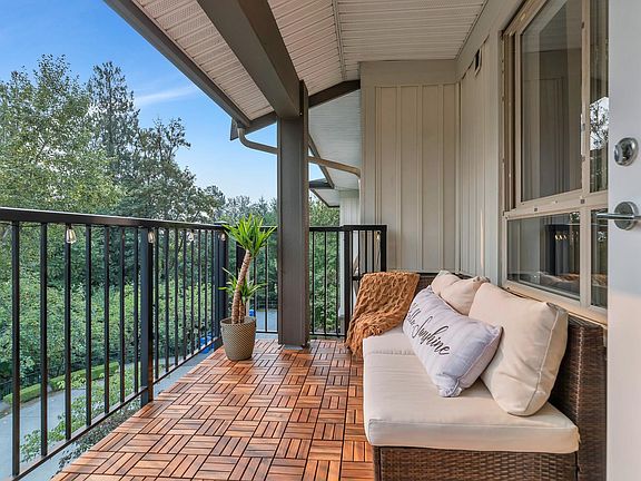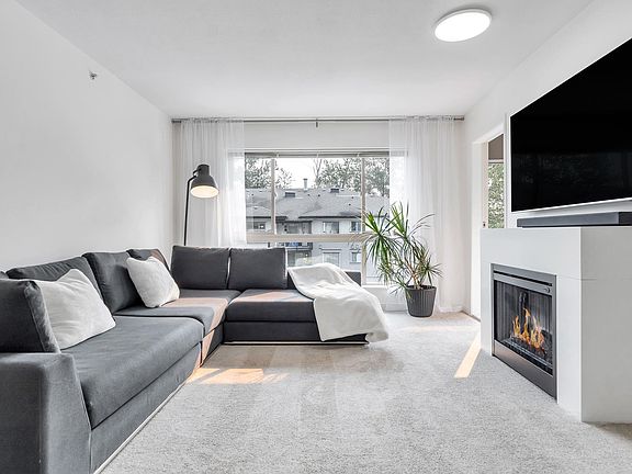 Enjoy this top floor oasis with unique wide layout, separating the two bedrooms for ample privacy. Versatile flex space is ideal for a home office. Modern updates: fresh paint, contemporary fixtures & lighting, upgraded appliances. Step out onto your private, covered patio—an extension of your living space that invites you to enjoy fresh air and tranquil views in any season. Two secure parking spots and a dedicated storage locker. The building offers access to a full gym, amenities room, guest suite, and welcomes pets. Ideally located near the WestCoast Express for quick commutes. Experience the next chapter of your life in a space that truly feels like home! Contact your Realtor to book your private showing today. Open houses Sat. & Sun. 2-4pm.