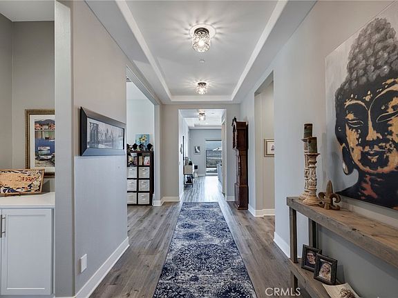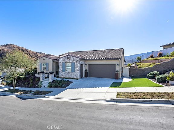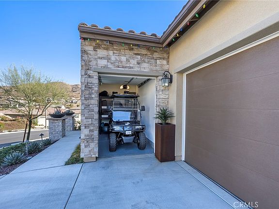 Welcome to Terramor, an award-winning gated 55+ community offering luxury living and spectacular views of rolling hills and Saddleback Mountain. Situated on a private tiered lot, this home combines elegance, privacy, and modern upgrades for the ultimate lifestyle. As you step inside, you’ll be greeted by soaring 10’ ceilings, recessed lighting, and luxury vinyl flooring throughout. The open-concept design includes stacking sliders in the living and dining rooms, creating a seamless indoor-outdoor flow perfect for entertaining. The living room includes a 7.2 full surround sound system to make movies more entertaining. Surround sound enhances the den, primary bedroom, California room, and garage. The gourmet chef’s kitchen features an oversized island, upgraded Bosch stainless steel appliances, and elegant finishes. Both guest bedrooms include en-suite bathrooms, while the primary suite offers stunning mountain views, his-and-her sinks, an upgraded shower, and an oversized walk-in closet with custom built-ins. The home is thoughtfully upgraded with 30 high-efficiency solar panels, an EV charging station, water softener system, a central vacuum system, smart garage door openers and a sophisticated Lutron lighting package controlled via an app. Built-in cabinets and overhead storage racks provide ample organization in the garage, which also includes a golf cart garage. Outdoors, the backyard is a true oasis with stamped concrete, pavers, low-maintenance artificial turf, a jacuzzi spa, built-in BBQ, outdoor fireplace, and a putting green modeled after Augusta’s famous 16th hole—all framed by breathtaking views. The back yard has an elevated bistro table and two citrus trees for relaxing in the sun. Terramor offers a resort-style lifestyle with amenities including a clubhouse with a full bar, three swimming pools, an indoor gym, a sauna, pickleball and tennis courts, bocce ball, a game room, a craft room, outdoor fire pits, dog parks, a community garden, and a variety of clubs and activities to enjoy. This home is the perfect blend of luxury and comfort in a vibrant 55+ community. Don’t miss your chance to experience the unparalleled Terramor lifestyle!