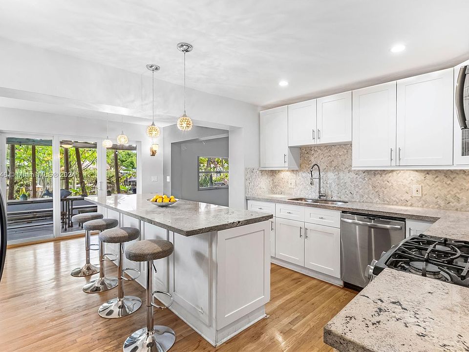 Don’t miss out on this beautiful waterfront 3-Bed, 2-Bath single family home! This charming home features a stunning fully remodeled kitchen and bathrooms. Chef's kitchen features custom made cabinetry with pull-out shelves, large island, gas range & wine cooler. Impact doors & windows, roof is 4 years new, solar panels installed 3 years ago for maximum energy savings. The waterfront fenced backyard comes with a spacious outdoor living space, fruit trees, and a magical koi pond. Conveniently located close to the beach and plenty of restaurants. Truly a must-see! *Actual sq ft (1670' per appraiser's measure) is larger than shown on tax roll. This cul-de-sac block of Hayes Street is one of the highest elevations in the neighborhood.