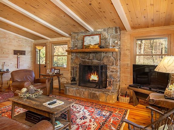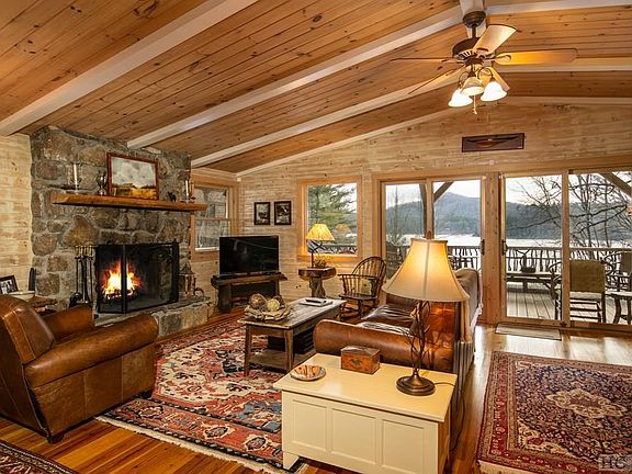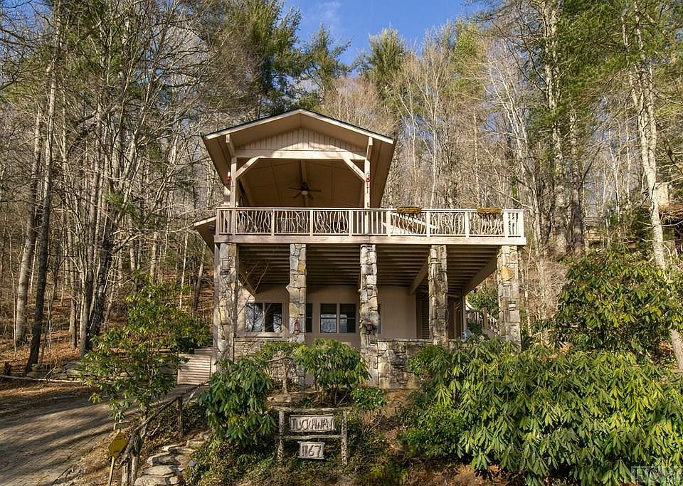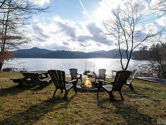 Magnificent scenery and cool temperatures highlight the short drive from the crossroads to this gorgeous waterfront mountain home on the east side of Lake Glenville. A stone-faced fireplace is the focal point of the great room, which opens to a large covered back deck with its own fireplace, overlooking the sparkling waters of the lake below. For effortless entertaining, the chef's kitchen complete with fine cabinetry, premium appliances, and granite countertops is central to the floor plan. The master bedroom and two guest rooms are conveniently on the main level. The game room is the perfect area for the family to gather around a game of pool while admiring the lake views. A path guides the way to the fire pit and the private dock. Family and guests of all ages will love this paradise getaway with so many activities to enjoy, such as boating, swimming, fishing, canoeing, picnicking, hiking, and more!