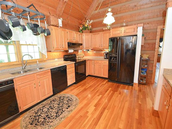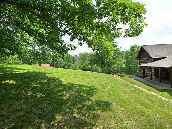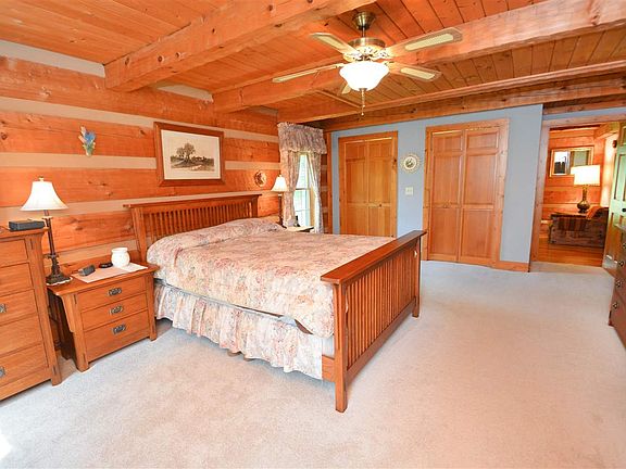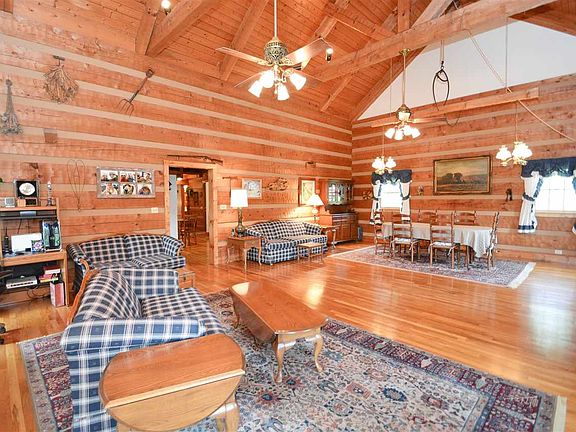 Country living at its finest*Quality built, custom log home impeccably maintained*Nestled into 8.67 wooded AC*Loads of privacy yet just mins from expressway access*Desirable 60 x 32 heated detached Garage*Great Rm w/ soaring Beam Ceilings & over-sized stone FP*Hrdwd flrs*Impressive Kitchen w/ granite counters & wood cabinets walks out to covered back porch*First Flr Master & adjoining Bath*Duel fuel heat pump/propane gas backup*Spacious 2 car built-in Garage*Clubhouse w/ rope swing-every child's dream*Pictures do not do this home justice-must see in person*Like living on vacation year around!