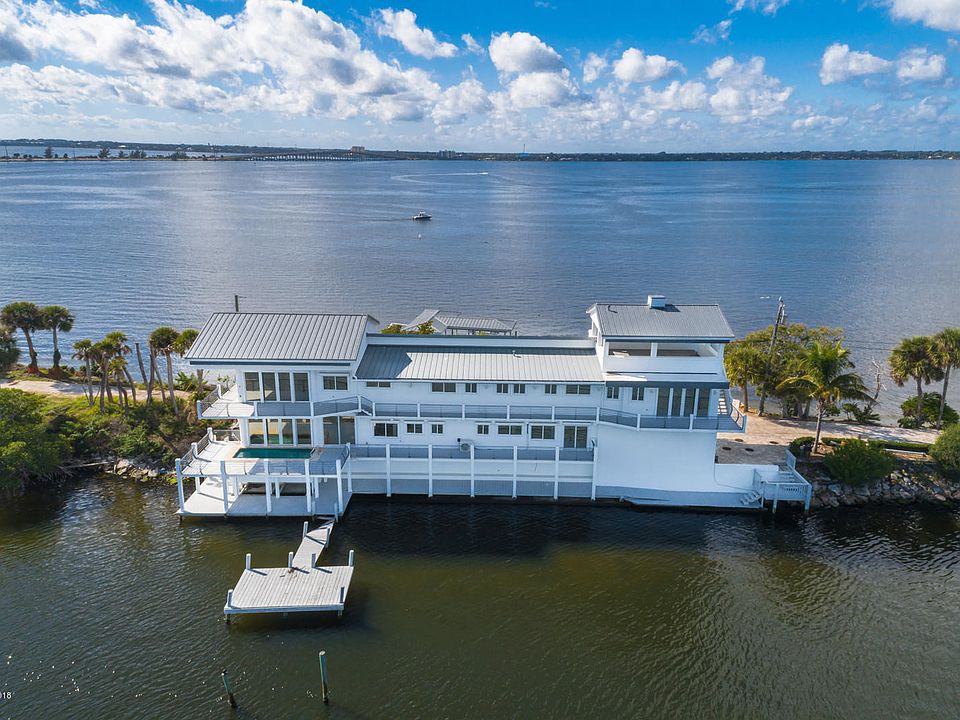 Imagine yourself enjoying Breathtaking Panoramic water Views from this iconic luxury home on Dragon Point between the Indian & Banana Rivers with DEEP water access at the southern tip of Merritt Island. With nearly 200 feet of water frontage on each side to accompany a large Yacht on the east side while holding your smaller vessels to the west. This 2010 totally reconstructed home is built with Solid poured concrete & features 4 bedrooms, 4.5 Baths (2 master suites), an elevator, whole house audio system, heated pool on the 2nd deck & built with the finest in quality materials like 24 inch marble floors, Custom cabinetry, impact glass windows with additional electric roll down shutters on all windows, plus an additional 1,100 sq ft (on 1st level) that can be built out custom to your liking