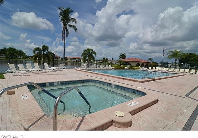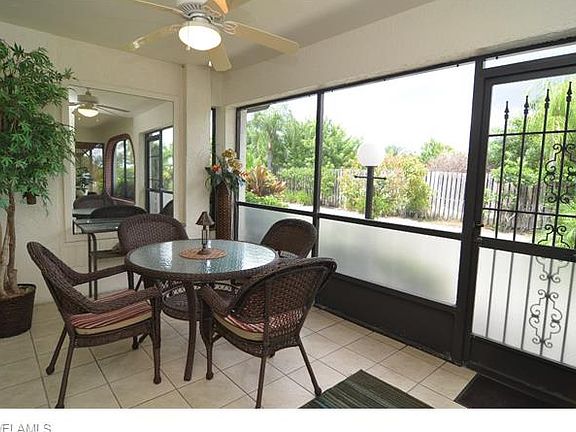 Rarely available pool villa in Cinnamon Cove! This is one of the few villa groups with its own neighborhood pool, this 2 bed/2 bath end unit villa with front and back lanais features beautiful rich wood laminate flooring throughout, complemented by tiled kitchen and bath; not a stitch of carpeting in this home! Nicely furnished and located close to your covered parking space so toting groceries is a breeze! Enjoying a swim in your neighborhood pool is as simple as walking out your lanai-or head for the clubhouse and enjoy the many activities available at Cinnamon Cove; tennis, bocce, shuffleboard, table tennis and billiards. If that isn't enough, you have a library, theater group, card rooms, exercise classes, water aerobics, water yoga, and so much more -top that off with a full time Activities Director, and the toughest part of your day may just be choosing which activity to do next! Cinnamon Cove is located in close proximity to dining, entertainment, quality health care, and the beautiful beaches of Fort Myers and Sanibel Island. Before cold autumn winds start blowing, schedule your appointment to see this pool villa! You could soon be enjoying the Florida lifestyle too!