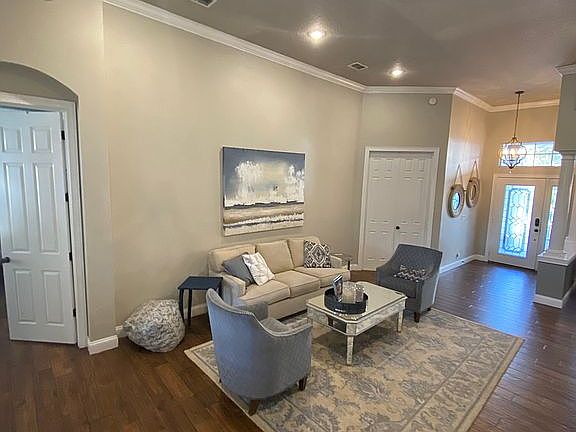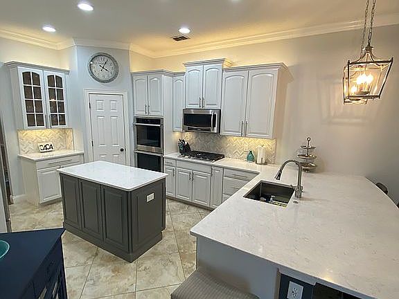 Huge corner fenced in lot in Keene's Pointe perfect for pets and children. Two and a half car garage leaves ample room for two cars and golf cart parking. Home includes a split bedroom floor plan, five bedrooms plus an office with an upstairs bonus room, bedroom, and full bathroom perfect for guests. Expansive caged lanai with architectural columns.. Greatroom is very large with wood burning fireplace. Newly renovated kitchen/quartz counter tops. Appliances all stainless steel. Crown molding in kitchen, greatroom, and all formal rooms. Plantation shutters, pavers front and back. Home features a new roof and recently painted exterior.