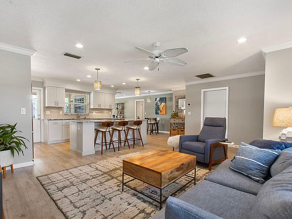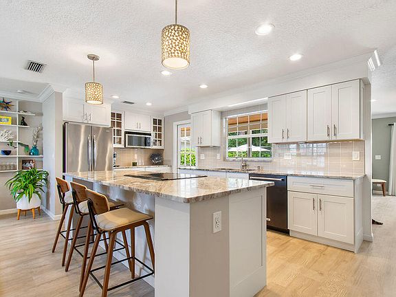 Move-in Ready, absolutely stunning, beautifully renovated 3BR 2BA, pool home, 2 car garage w/ metal roof in the sought after Garden Woods community perfectly located in the heart of Palm Beach Gardens! This open split floor plan features, a renovated kitchen w/ large island and a view of the pool. Renovated Kitchen w/ stainless steel appliances, stunning quartz countertops w/ a gorgeous backsplash. Beautiful wood large plank laminate floors and crown molding throughout. The primary suite features a large bathroom w/ marble floors, walk in shower & large walk-in closet w/ custom shelving. The fenced-in private backyard is a tropical oasis, great for entertaining. The beautiful pool has a swim platform & fountains. The covered patio w/ tongue & groove ceiling flows to expansive travertine patio leads to the 12 x 15 covered entertainment pavilion w/ recessed lights, fan and tongue & groove ceiling which leads to the sculptural fire pit all surrounded by lush landscaping. Perfect for entertaining! The side yard is large enough for your boat or RV.