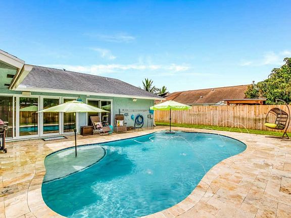 Beautiful, must see updated 4 bedrooms, 2 bathroom, 2 car garage Pool home in Wellington's South Shore neighborhood. Enjoy your new (2017) pool with travertine deck, sun shelf w/ 2 bubblers & umbrella, conversation pit w/Jacuzzi jets, table & umbrella all while being entertained with the fountains and colored LED lights (prewired for outdoor speakers). Remodeled kitchen with granite counters, center cook island, stainless steel appliances, and beautiful view of pool area. Homes offers Impact storm windows and doors (2017), tile throughout (carpet in 3 secondary bedrooms), remodeled master bathroom w/ dream shower (rainfall shower head and body sprays), custom master closet, 4th bedroom currently used as media room (does have closet) and has hidden book shelf entrance, newer a/c units,