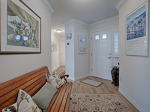 This spacious, (1602 SF) CABANA COURTYARD VILLA is located steps from LAKE SUMTER LANDING in the coveted CREEKSIDE VILLAS. This lovely 3/2 ANNA MARIA villa is offered fully FURNISHED/TURNKEY! The home is upgraded throughout with gorgeous MOHAWK WOOD-LOOK FLOORING, CROWN MOULDING, PLANTATION SHUTTERS, fresh new KITCHEN CABINETRY with Champagne Bronze hardware, and QUARTZ countertops! The kitchen's GLEAMING QUARTZ counters are enhanced with a stunning MARBLE TILE backsplash in a contemporary, herringbone pattern. High-end STAINLESS appliances include a glass-top, slide-in range with convection cooking option, 3-door refrigerator, dishwasher and a space-saver microwave. A Quartz-topped center island, a pantry, and new LED lighting are additional features of this beautifully-designed kitchen. The OPEN dining and living rooms feature VOLUME CEILINGS, providing a spacious feel. There are two sets of sliding glass doors that open to the screened lanai, one from the dining room and another in the living room, which create a light-filled interior! The master bedroom has volume ceilings, a walk-in closet with CUSTOM BUILT-INS, and an en suite bath with a QUARTZ counter, dual-sink vanity, and tile surround shower. There are two beautiful guest bedrooms, and a guest bathroom featuring a Quartz counter, and a shower/tub combo. The spacious courtyard features low maintenance, stone-covered landscape beds. There are numerous upgrades throughout this lovely home including, NEW HIGH EFFICIENCY HVAC system, EPOXY garage floor, a NOVA water system, cabinets in the garage, and solar tubes. The amazing location of this LOVELY VILLA offers every convenience, with dining, shopping and ALL THE FUN of living at Lake Sumter Landing Square , in the heart of The Villages!