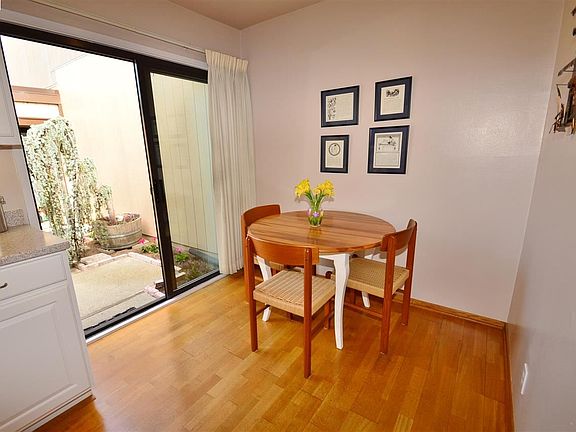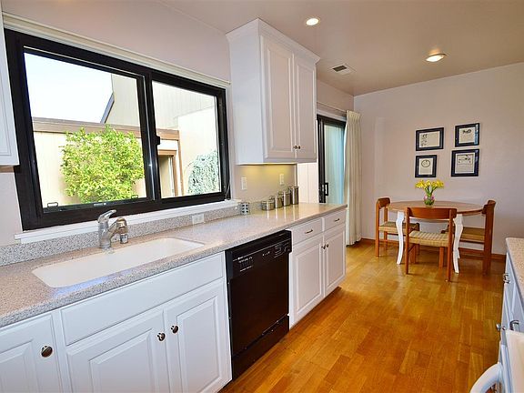 Stylish single level "A" model in Garden Isle, remodeled kitchen with custom cabinets, corian counter and recessed lighting, updated baths with custom cabinets and tile floors, hardwood floors, dual paned windows and sliding doors, wood shutters, private patio, two car garage with built-in cabinets