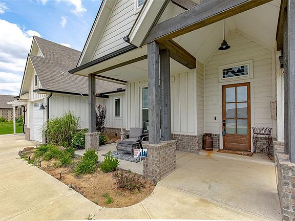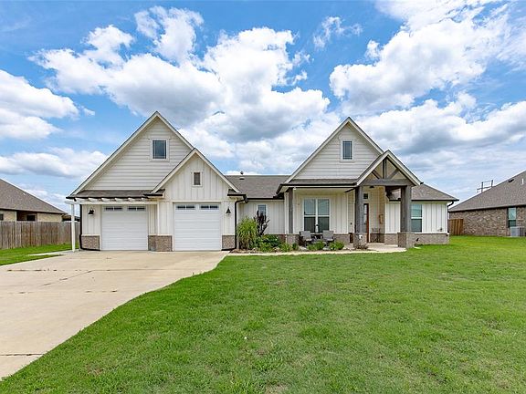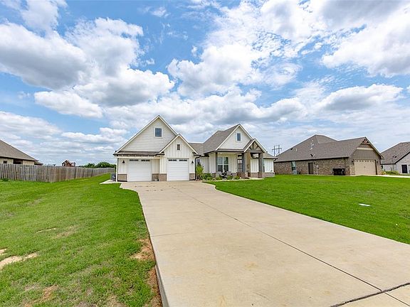It's summer, don't you wish you had a salt water pool? Stunning modern farmhouse on 3/4 acres, with shops allowed! Modern living, with a country feel. Open living area, kitchen, eat-in dining room plus a formal dining area. This home offers a butler's pantry, large utility room with mud bench off the over-sized garage. Kitchen features a large island with a farm sink. Gas cooktop. Wood plank flooring and brand new carpet. Split plan with primary bedroom on opposite side of home from other 2 bedrooms. Pool has new automatic pool cleaner. New hot tub with blue tooth radio is negotiable. New outdoor in-ground storm shelter. Home is a buildable plan with the ability to add a bonus room above the garage. Located in a newer addition approximately 8 miles north of Shawnee, right off Kickapoo. Just north of I-40.