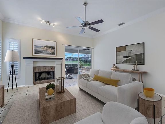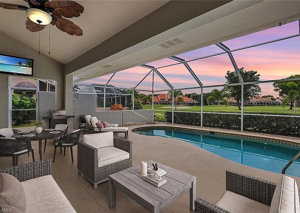 Your opportunity to claim this 2,000 square foot pool home where move in ready style and comfort come together in a highly sought after Naples location. With Southern exposure, a private heated pool, all NEW plumbing, an optional included golf cart, and peaceful views of the 10th and 18th holes, this residence offers the sunny, easygoing lifestyle that’s increasingly rare at this price point. Soaring ceilings, abundant natural light, and a thoughtful split bedroom layout enhance both flow and privacy. The spacious owner’s suite provides a true retreat with lanai access and a spa inspired bath featuring a freestanding soaking tub, walk in shower, and generous closet space. Timeless upgrades like granite countertops, stainless steel appliances, tile flooring, crown molding, elevated lighting, and a custom dry bar with wine fridge add everyday luxuries. The home’s St. Andrews floor plan includes a private guest wing and a versatile den, offering ideal flexibility for a home office, media room, or visiting friends and family. Complete with an included social membership, this home places you in one of Naples’ most welcoming and established gated communities, while also offering access to top rated schools and unbeatable convenience with nearby shops, dining, daily necessities, and I-75 just minutes away.