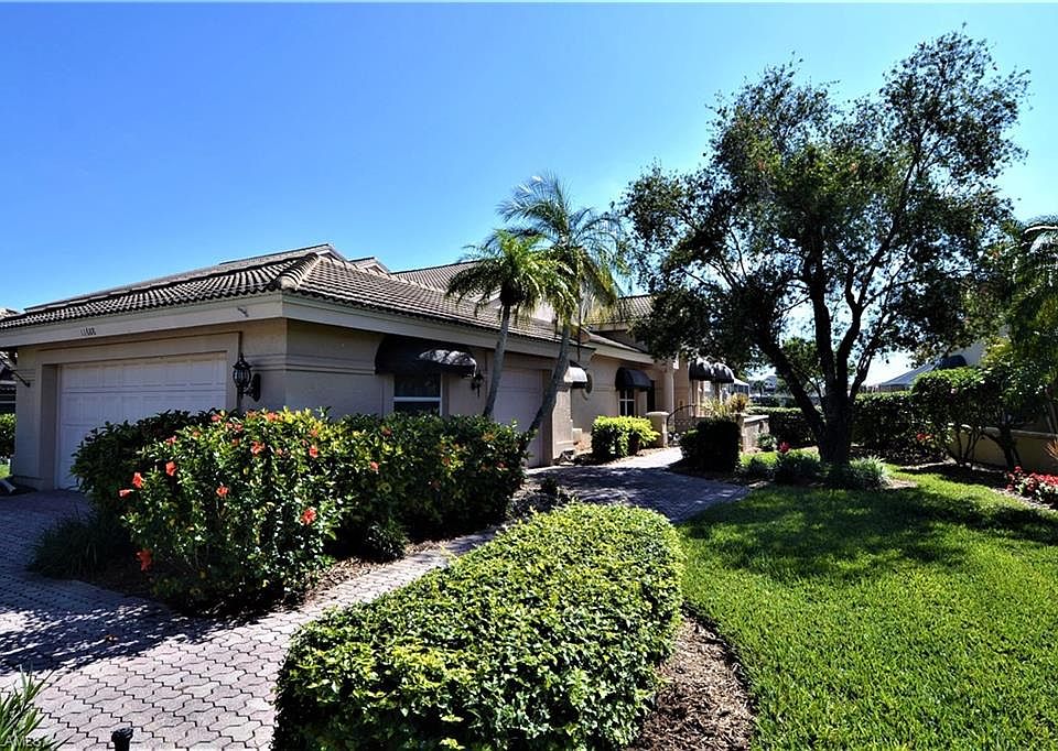 GORGEOUS END UNIT VILLA WITH BEAUTIFUL SOUTHERN GOLF COURSE VIEWS. COMPLETE SMART HOUSE. LARGE TILED SCREENED LANAI WITH WATER DISPLAY. UPDATED KITCHEN WITH QUARTZ COUNTER TOPS, SUBWAY BACKSPLASH, WHITE CABINETS AND APPLIANCES. DARK WOOD FLOORS AND CROWN MOLDING THROUGHOUT, FIREPLACE AND WET BAR IN LR, LARGE MASTER SUITE WITH PRIVATE COURTYARD, 2.5 CAR/GOLF CART GARAGE AND MORE. MUST SEE ! ! SOCIAL CLUB MEMBERSHIP INCLUDED FOR ALL HOMEOWNERS. AFFORDABLE GOLF DUES ARE OPTIONAL.