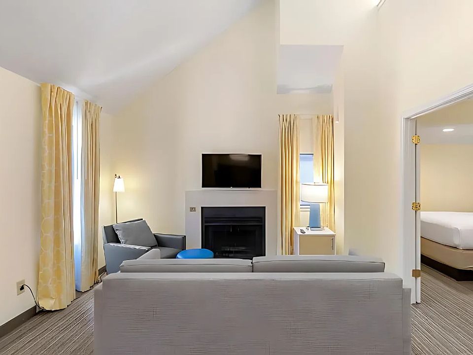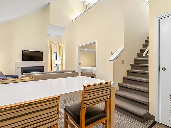 Spacious 2-Bedroom Townhome Suite Spacious 825 sq. ft. 2-bedroom townhome suite with a king bed, two full beds, and two bathrooms. Features a cozy living room with a fireplace, fully equipped kitchen (stovetop, oven, microwave, refrigerator, dishwasher), dining area, and flat-screen TV with cable. Enjoy free WiFi, air conditioning, hypoallergenic bedding, and complimentary toiletries. Perfect for extended stays, with all the comforts of home, including a tea/coffee maker and work desk. Please note, utilities are charged at a monthly rate of $300 which includes electric, water, gas, cable and internet *Rates are based on a lease of 3 months or more. Rates may vary based on length of stay