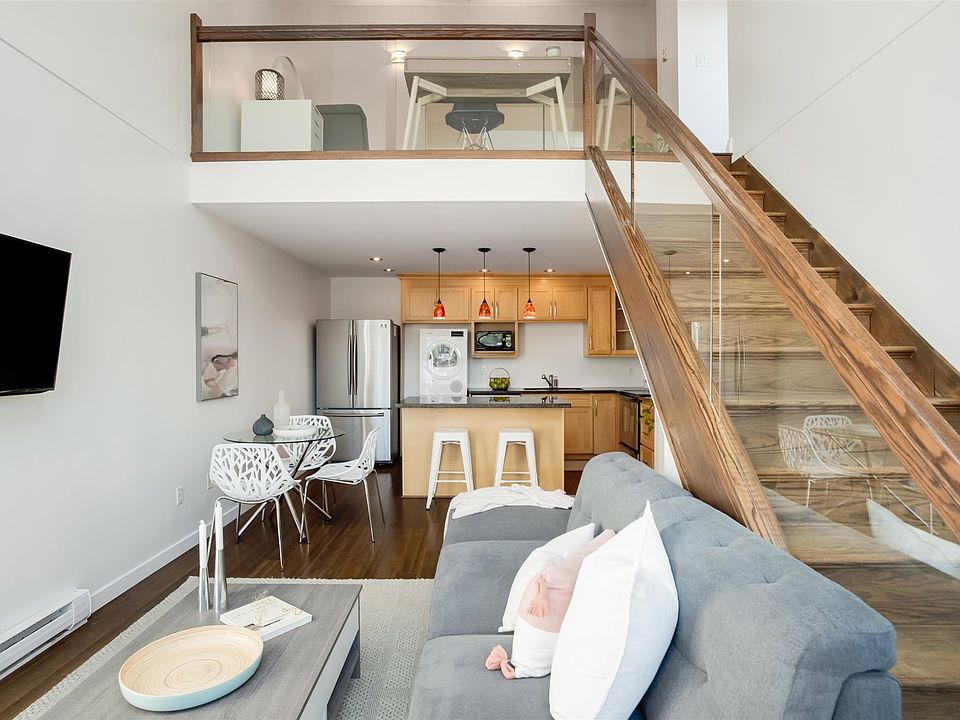 Modern loft living at Fraser Gardens This updated home features soaring 15' high ceilings with over 1,000 sqft of living space plus generous outdoor living with partial views of the Fraser River. Open plan kitchen+living area features solid wood cabinetry, SS appliances & large island, perfect to cook and entertain! Master bedroom and updated bathroom are located on the main floor. The upper floor presents a loft, perfect as an extra bedroom with office, great room, nursery etc. Well maintained fully rainscreened building with some rentals and pets allowed. Conveniently located in the heart of New Westminster, only steps to Moody Park, shopping, cafes and transit. Perfect for first-time buyers and investors alike. Open House, Sunday August 8 1:30-3pm