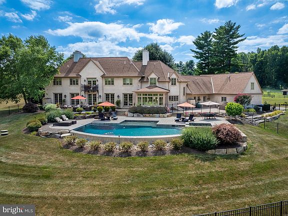 Welcome Home! Enter onto a long tree lined driveway to Seventeen Acre Wood Farm in the heart of Chester Springs. This immaculate property features a 6,337 sqft home, detached 4 car garage, barn with 5 stalls and pastures, inground pool, large backyard and pond with dock! The updated and immaculate Archer and Buchanan 4 Bedroom, 3 full bathroom and 2 half bath home boasts over 6,337 square feet of finished and sun filled space. The exterior is constructed of stucco over concrete block. Enter through the double doors into the foyer with a sweeping custom staircase. The living room boasts two fireplaces and great views of the back living space, pool and property. Continue on into a private study/ library off of the living room. The formal dining room is spacious and also has a great view of the property. Continue into the beautiful kitchen and breakfast area with stainless steel appliances, a fireplace and many improvements from 2021 and 2023 throughout. The first floor also features a butlers pantry, office area, mudroom and second staircase. Upstairs you will find a lovely primary bedroom with a large office, walk-in closets, fireplace and a spacious bathroom with a freestanding tub and separate shower, 2 sinks and radiant floor heating! Additionally there are 3 other bedrooms and 2 full bathrooms as well as 2 sets of washer and dryers on the second floor, and a bonus/rec room. There is a finished basement with a full bar, large living space and a dance studio/home gym. The detached lower garage has 4 bays; 3 bays inside the finished portion and 1 bay designated for lawn and farm supplies. The lower garage also has a climate controlled office space. The main barn features 5 stalls, tack room with washer and dryer, hay loft and acres of fenced pastures and 90 by 70 riding arena. The outside living space features a large patio and infinity pool and spa built in 2016. The pool area is beautifully placed in the backyard and completely private. The amount of pool parties and gatherings one could host! Continue your time outside with a walk towards the pond to the fireplace and patio. Many summer evenings, you can enjoy your sunsets and smores around this well thought through space. This farm is unquestionably well maintained and well loved. No matter where you turn, you experience beauty and tranquility that Seventeen Acre Wood Farm embodies.