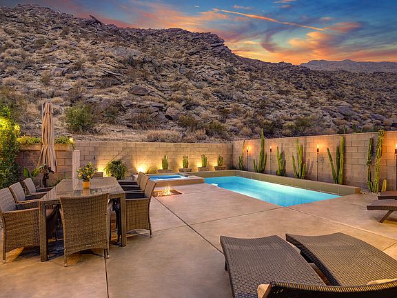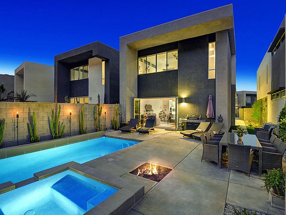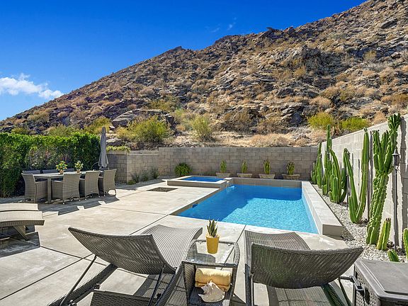 Enjoy spectacular mountain views from this fabulous two bedroom, two and one half bath home in the gated community of Dakota! This lovely home is the largest floor plan in the development and features two oversized master bedroom suites plus den area. It boasts top-of-the-line fixtures & finishes including beautiful hardwood floors throughout, Porcelanosa tile and La Cantina bi-fold doors. The Chef's kitchen showcases Viking appliances, Caesarstone countertops, tile backsplash, Blanco sink and a Hansgrohe faucet. Additional upgrades include custom paint, ceiling fans, security system and built-in speakers for sound in both bedrooms and outdoor entertaining area. The great room's La Cantina bi-fold doors open to a private rear yard for the ultimate indoor/outdoor Palm Springs living. Exterior amenities include a Pebble Tek pool and spa, Pentair remote control system, fire pit, and gorgeous views of the mountains. The 2 car attached garage has a tankless water heater, and a Culligan water softener system (owned). This sleek and contemporary home is on fee land (you own), offers low HOAs, and is in a prime location providing easy access to some of Palm Springs' best restaurants & shopping destinations.