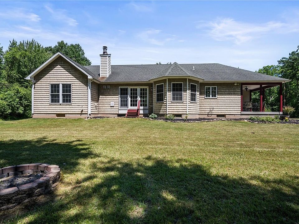 WOW! Nestled deep within a private sanctuary on 5.25 acres of pristine land, this 2006 built ranch-style home offers unparalleled seclusion, tucked back in over 1000 feet off the road. Boasting 1859 sq ft of living space, the home features 3 bedrooms and 2 full bathrooms with an inviting wide open floor plan. The kitchen is appointed with solid surface countertops, abundant island & cabinet space, gleaming hardwood floors flow throughout the main living areas. A cozy woodburning stove enhances the ambiance, perfect for chilly evenings. Outside, a spacious patio with a sunshade offers an ideal spot for relaxation and entertaining. A highlight of the property is a 30x40 barn/shop with a finished bar area upstairs, providing ample storage and potential for various uses. Nature enthusiasts will appreciate the blend of 1 acre of meticulously manicured lawn and 4 acres of prime hunting grounds, frequented by trophy deer and graced by the occasional visit of bald eagles and falcons overhead. Meticulously maintained by its single owner, this retreat offers a rare opportunity to enjoy peaceful country living at its finest and won’t last long!