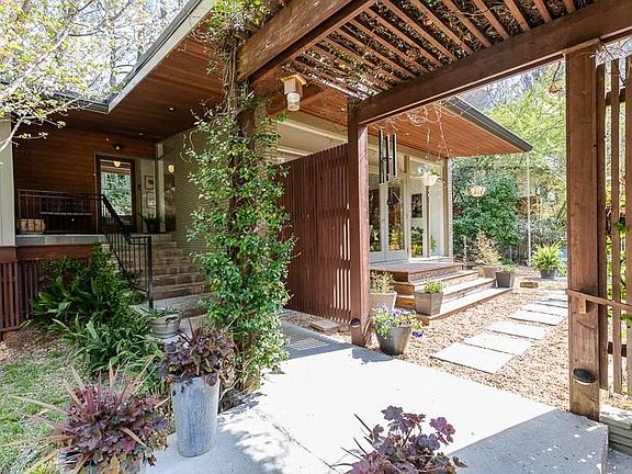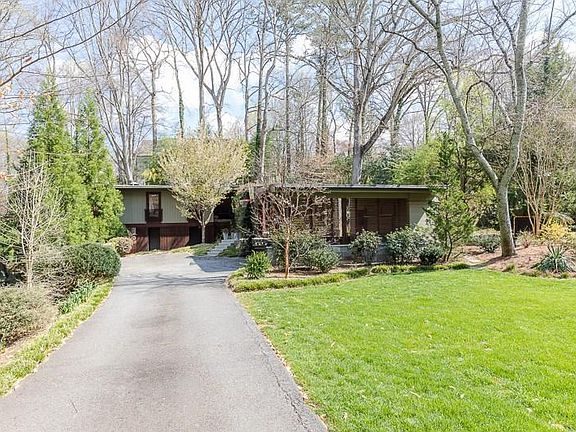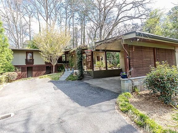 Mid-Century modern classic, flows seamlessly from every room into the natural light filled surrounding gardens. Total renovation including kitchen that opens to the family room and back patio. Cascading dining room, living room combination. Master on main with brand new master bathroom. Three additional bedrooms on the main level. Perfect recreation/media room on terrace level that opens to side yard with babbling creek and covered outdoor patio. 2 car carport. Gorgeous wooded lot. Incredible location.