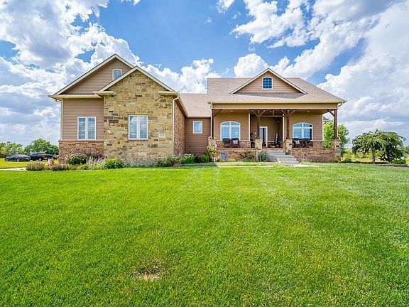 Wow - Outstanding country living with sunset views on 5 acres m/l. Beautiful designed custom home with lots of upgrades and features. Enjoy the oversized front porch as well as the covered back deck and walk out basement patio. Every room has great detail: Formal living room and private formal dining room. Big beautiful kitchen and informal dining with oversized island bar for entertaining. The master suite is spaceous and private bath has double vanity, walk in shower and whirlpool tub. Master closet with access to laundry room. Then there is the finished walk out basement. Theatre room (Projector is negotiable). Rec area with pool table. Game table and full wet bar. 4th bedroom and excersize roon/office.