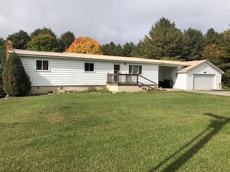 Looking for your own oasis close to town? This three bedroom one bath home sits on a 1278 sqft walkout basement and comes with 10 beautiful acres! Natural gas forced air furnace installed just last year. Newer metal roof and two car garage. Plumbing recently updated with new water softener. There is a huge barn that you can pull your full size RV right in to! Beautiful large yard that serves as a food plot and an awesome elevated blind to hunt your own property. Deer and turkey abound with trails though the woods. Possible fourth bedroom has been started in the walkout basement and this home would boast a whopping 2625 square feet when finished! Ride to the ORV trails right out your door! Close to town on a paved county maintained road. A little updating will make this your up north oasis! Buyer or buyers agent to verify all measurements.