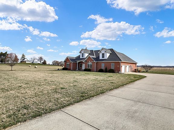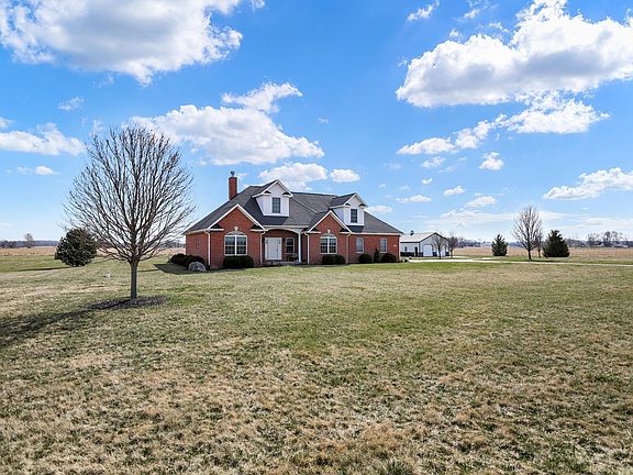 This meticulously maintained solid brick home sites on more than 5.5 acres and has a partial basement. The open concept split 3 bedroom, 2 bath home features a woodburning fireplace, cathedral ceilings, hardwood floors, granite countertops, stainless steel appliances, updated light fixtures, fresh paint, and more. The kitchen has tons of storage and functionality, with an eat-in area that leads to the covered porch. Don't miss out on these sunset views. The basement has an epoxy floor with a full bathroom rough-in. Storage and opportunity abound in the 30x48 heated pole barn. The pole barn is drywalled and ready for any hobbyist with 10 ft ceilings and 9ft 9.6 inch doors. This is a one of a kind property.