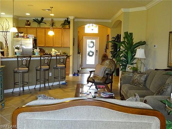 MODEL HOME by Lennar--This ranch floor plan features high ceilings, arches, spacious rooms, and many upgrades. This lavish landscaped home was the Model of Olympia Pointe only lived in for 6 months. Model Home has designer features, lighting fixtures, wall hangings and accessories with many upgrades including: Painted Ceiling Mural in Dining Room with Window Treatments; Kitchen with Crown Molding, Window Treatment; Living Area with Crown Molding, Window Treatment, Mirrored Wall Panels; Bathrooms with wall murals; Master Suite with Panels on Wall, Crown Molding, Window Treatment. The Master Suite includes walk-in closet, tiled walk-in shower, garden tub, 2 separate vanities. Jack and Jill Bathroom with two doors to access two bedrooms. Pavers line driveway, tile roof, sliding doors to screen lanai with peaceful preserve view. Gated community offering full amenities including Billiards, Community Pool, Community Room, Community Spa/Hot Tub, Exercise Room, Play Area, Sidewalks, Street lights. Conveniently located to Florida Gulf Coast University, Regional Southwest Florida Airport, Miramar Outlets, restaurants and beaches.