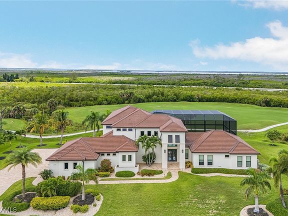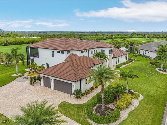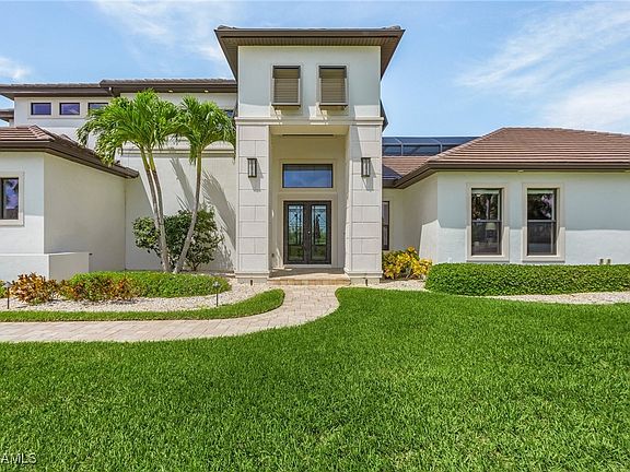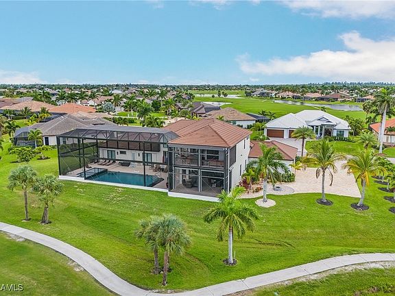 Step into the epitome of luxury living with this exceptional 2-story, 5-bedroom, 3.5-bath resort-style pool home nestled in the prestigious Cape Royal community of Southwest Florida. Honored with an Aurora Award for architectural excellence in the Southeastern United States, this distinguished property has graced the pages of Grandeur magazine, News Press, and Architectural Digest. Enjoy stunning western exposure providing unobstructed views of Southwest Florida's mesmerizing sunsets. Embrace a world-class lifestyle with access to the acclaimed 27-hole Cape Royal golf course, perfect for golf enthusiasts and families seeking the ultimate Florida experience. Relax in the expansive saltwater pool and spa, complemented by poolside games, an outdoor kitchen with a bar, and big-screen TVs for seamless entertainment. Gather around the fire pit for cozy evenings under the stars. Inside, discover Cambria quartz countertops and European dark wood cabinets throughout, creating an ambiance of timeless elegance and functionality. The upstairs master suite boasts a spacious bathroom with an inviting walk-in shower. Step onto the balcony from the master suite and soak in panoramic views of the pool, golf course, and serene lake. This exclusive property offers an unparalleled opportunity to indulge in luxury living, whether you're hosting gatherings with friends or seeking a tranquil family retreat. Experience the ultimate in comfort and sophistication in one of Cape Royal's most coveted homes. Don't wait, schedule your showing today for a chance to experience this amazing property!