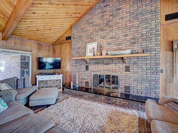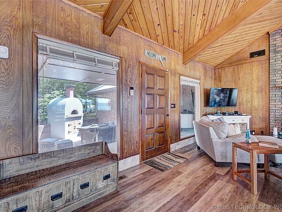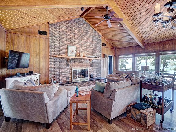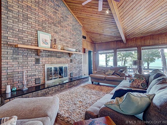 Nestled on 1.3 acres of picturesque land, this lakefront property at Eufaula Lake offers a tranquil retreat like no other. Boasting three spacious bedrooms, each with its own private bathroom, this home ensures comfort and privacy for all. The upstairs living room features a bricked wood-burning fireplace, creating the perfect ambiance for relaxation. Immerse yourself in the beauty of nature through the expansive windows that flood the open upstairs living room with natural light. Every detail has been carefully considered to enhance your living experience. Step out onto the back porch and marvel at the breathtaking views of the lake, or indulge in outdoor entertainment with an Italian imported pizza oven in the dedicated area. For those seeking a peaceful sanctuary, a closed-in sunroom provides an ideal space for reflection and tranquility. Not only is there one double car garage but two an enhanced convenience. Whether you're enjoying a morning coffee or hosting gatherings, this property offers endless possibilities.Embrace the serenity of lakeside living in this meticulously designed haven.
