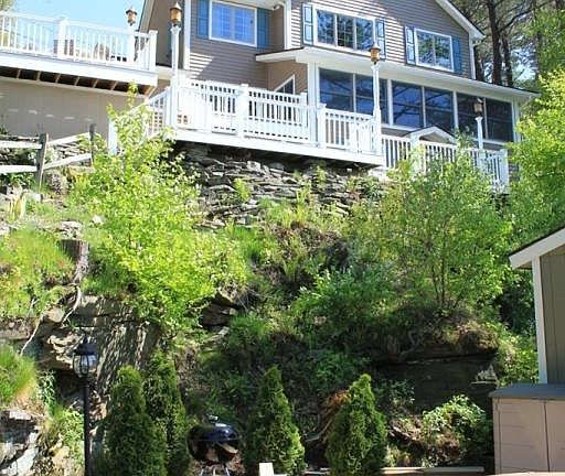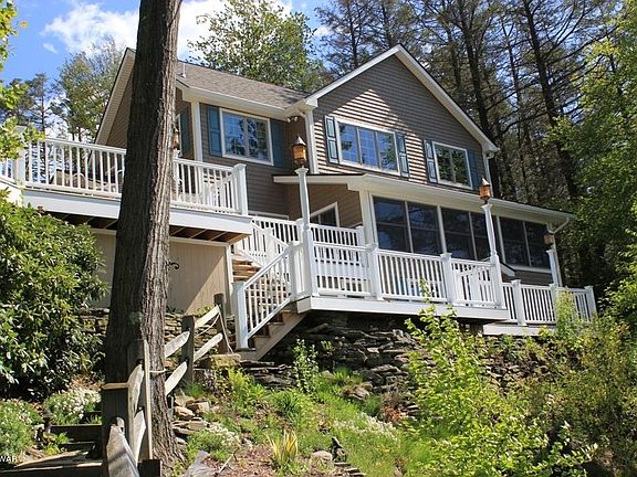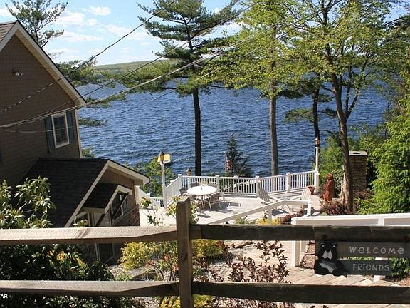Lake Wallenpaupack Lakefront Family Compound-Custom Built 4 bedroom contemporary tucked away on stone ledge. Modern kitchen features granite countertops & new appliances. Great Room windows provide a panoramic view of Lake Wallenpaupack & allow sunlight to pour in. Fully landscaped, featuring stone walls, 1800 SF of decking, outdoor stone FP & 24x50 private dock w/room for boats & wave runners. Includes a remodeled 2 bedroom guest cottage. Unique & rare property. Must be seen to be appreciated.