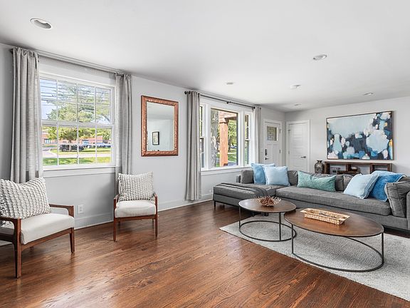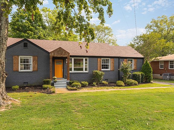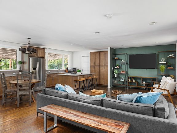 Charming single-story home features a stylish modern look with a dark, painted brick exterior complemented by rustic wooden shutters and porch accents. The well-maintained landscaping provides an inviting curb appeal,. The mature trees surrounding the property provide plenty of shade and a sense of privacy. Inside, the home boasts an open-concept layout with a seamless flow from the kitchen to the living area. The kitchen offers modern stainless steel appliances, custom wooden cabinetry, and a central island with bar seating, perfect for entertaining. The living space feels cozy yet spacious, with plenty of natural light from large windows. The stylish bathroom is a highlight, offering a spa-like atmosphere with its floating vanity, concrete countertop, and modern round mirror. The spacious glass-enclosed shower features stone tile work and a sleek, minimalist design. A mix of warm wood tones and contemporary furnishings gives the home a balance of comfort and style.