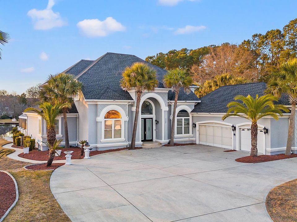 Welcome to 117 Ashley River Rd, an exceptional Mediterranean-style 5-bedroom, 3 full and 2 half-bath home that offers the perfect blend of luxury, comfort, and style. This magnificent property boasts your own private docks, providing easy access to the water for all your recreational needs. The backyard oasis features an in-ground private pool and hot tub with a newly screened-in area, complete with a bar for seamless entertaining. Approximately two years ago, the sellers converted the pool from chlorine to saltwater and upgraded all the pool equipment and pumps. They also installed new screens in the lanai and replaced all the wood on the dock, ensuring everything is in top condition. The spacious 3-car garage is equipped with auto lifts for additional storage, making it ideal for all your vehicles and outdoor gear, and includes two Tesla chargers for added convenience. As you step inside, you are greeted by luxurious staircases that make a grand statement, setting the tone for the rest of the home. The soaring 20+ foot ceilings create an open, airy atmosphere, enhancing the overall sense of space. Rest easy knowing that major updates have been made to ensure your comfort and peace of mind, including a new roof installed in 2022 and all three HVAC units replaced in 2023. A new hot water heater and a home filtration system further enhance the home's efficiency and convenience. Inside, you'll be captivated by the stunning triple crown molding that accents the rooms, while the surround sound system ensures an immersive experience throughout the home. The property is further enhanced by an advanced irrigation system and is surrounded on all three sides by picturesque lake views, creating a serene and private setting. Whether you’re lounging by the pool, enjoying the water, or simply taking in the beautiful surroundings, this home offers an unparalleled lifestyle. Nestled between Myrtle Beach and Murrells Inlet, you're just a short drive to everything including Myrtle Beach International Airport, Broadway at the Beach, Barefoot Landing, The Market Common, Coastal Grande Mall, 2 Tanger Outlets, Coastal Carolina University (CCU), Murrells Inlet Marsh Walk, Brookgreen Gardens, Huntington State Park, Myrtle Beach State Park, bike trails, marinas, public docks, landings, restaurants, golf courses, shops, and entertainment. Also, only 90 miles south to beautiful Charleston, SC. Don’t miss the opportunity to make 117 Ashley River Rd your dream Mediterranean retreat!