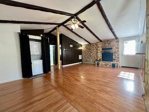 Decorative wood fireplacePartial wrap-around deckVaulted ceilingsStackable washer and dryer