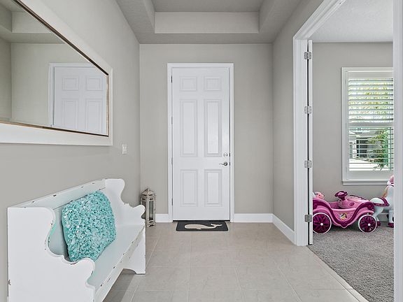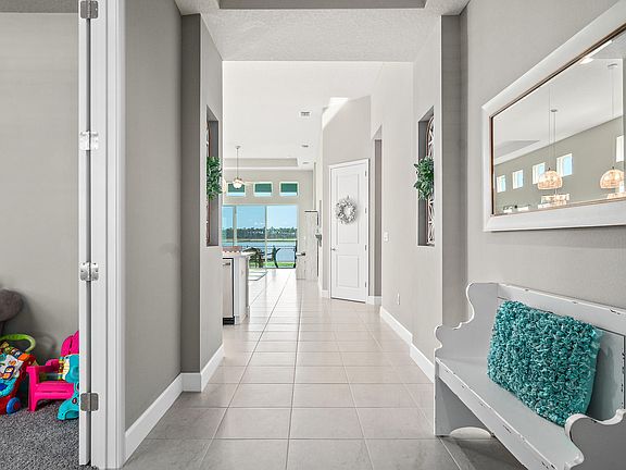 STUNNING Lake front home in the new development of Mosaic with all the upgraded features!! This 4 Bedroom PLUS FLEX room has an open floor plan and only built in 2018!! Walk through the front door into the private entry on TILE floors and trey ceiling. Flex room off to your right with french doors. Grand OPEN floor plan in this Oakland model. Deluxe Kitchen finished with STAINLESS STEEL built-in appliances, QUARTZ countertops, soft-close all WOOD 42in cabinets, TILE backsplash and large island. Opens onto Dining Room with beautiful light fixture and TILE floors. Tile floors continue into oversized Family Room with lots of natural light from the double windows, sliders out to lanai. Split floor plan with grand Master Bedroom. Views of the lake, 2 WALK-IN closets and en-suite Bath. Master