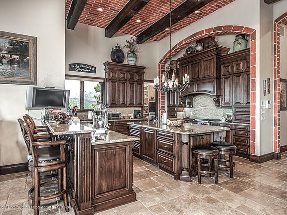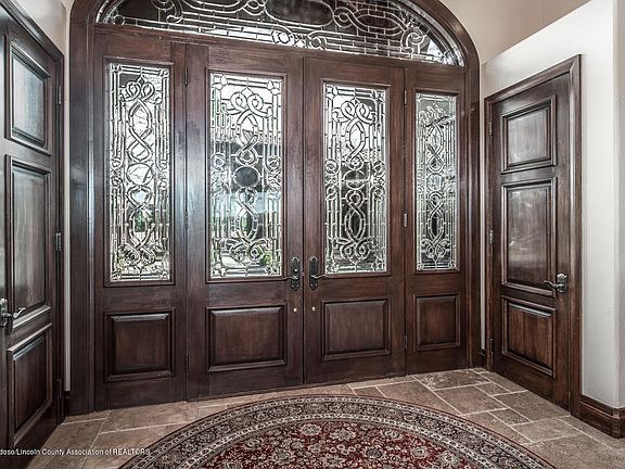 Stunning home with some of the best views in Ruidoso. Located in gated subdivision. 5 BR, 5 full baths 1, 1/2 bath. Guest quarters, 4 car garage. Huge outdoor living area with fireplace, wet bar. 2 living areas in main house. Main LR has wet bar, high beamed ceilings, FP, 2 TV's. Custom arched ceilings in hallways with custom paint. Travertine floors in main parts of home. Sub Zero refrigerator, wolf appliances. Solid granite tops. 8 ft. doors. Safe room, 2 sets of washer & dryers. High end finishes throughout.