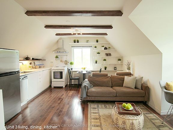 Welcome to your new home! This one-bedroom sanctuary (plus bonus room/office)has real character and might just be the answer to your prayers (well, maybe not all of them-but it's a good start). Located on the upper floors of a private triplex, this light-filled apartment blends century-home charm with modern comfort. Exposed beams, feature walls, and hardwood floors (made with actual wood) give it warmth and personality, while modern conveniences like en-suite laundry and dishwasher ensure you're firmly in the 21st century. The bonus room is perfect for a home office, to unleash your inner Picasso, or to practice yoga and meditation-whatever inspires your creative or zen side. Step outside to your massive private terrace surrounded by mature trees and lush greenery. It's like having your own treehouse - minus the drive to Muskoka (and the bears). On snowy winter days, a cozy nook in the living room awaits, perfect for curling up with a blanket and hot chocolate-because hibernation is real. With wonderful neighbors and a clean harmonious atmosphere, you'll feel at home from day one. As an added bonus, there's a shed-because your bike deserves a home, too. Located in Toronto's Upper Beaches-East York area, you're close enough to downtown with direct streetcar access to downtown for work and fun, yet far enough from the concrete jungle to enjoy peace and tranquility among mature trees. TTC streetcar is steps away, and Woodbine and Coxwell subway stations are both within walking distance. Woodbine Beach and the boardwalk are nearby-our own Canadian version of Baywatch (minus the slow-motion running). You'll pay 1/3 of the utilities (it won't break the bank) and need a street permit for parking (cheap!). The home is non-smoking. Well-behaved pets are welcome-except alligators. Vacant and ready for move-in. Come take a look and prepare to fall in love