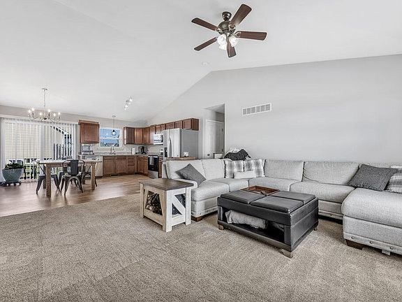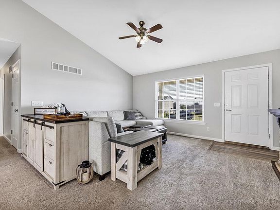 OPEN HOUSE SUNDAY SEPTEMBER 15th 11am-1pm. Adorable 3bdrm, 2 bath home in The Shire is move in ready and located on a level corner lot. The spacious covered front porch is the first welcoming to this great home. Upon entering you will be treated with an open floor plan, newer paint/carpet/LVP & vaulted ceiling. Kitchen features SS appliances and granite countertops. There is a huge main floor laundry between the kitchen and garage entry; there you will find additional closet space that could also be used as a pantry. Primary bedroom features a vaulted ceiling with lighted ceiling fan, closet and an en suite. The two additional bedrooms are roomy and have plenty of natural light. The garage has an extra space measuring 9x10 that could be set up as a work shop or used for additional storage space. Home also has a 3 year old roof w/architectural shingles & there is a full unfinished basement with a rough-in that could be finished to your liking for additional living space.