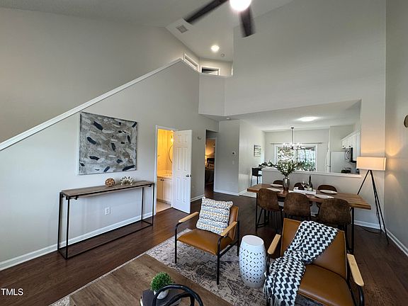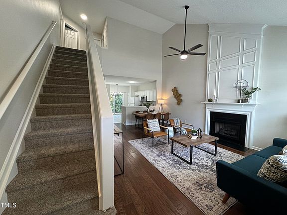 Prime Morrisville Location - Breckenridge Neighborhood. Mins to RTP, New Apply Campus, Wegmans food Market. Great Master down End unit townhome with no share walls - like a single family home. New interior paints and New carpet throughout! Brand New Range, Dishwasher and Kitchen flooring. Open and Spacious floor plan! Soaring 2 story Vaulted ceilings at living room features gas log fireplace with full wainscoting moulding wall, New ceiling fans. Eat in kitchen features Granite Countertop, Stainless appliances. Master bedroom with new ceiling fans, Master bathroom with double vanities and extended counter top, new light fixtures, garden tub and separate shower. 2 additional oversized bedrooms & a laundry room upstairs. Private backyard with a line of trees. Great Community Amenity - Pool, Tennis courts, Playground and Volleyball court. Walking distance Trails and Community Parks Roof 2017, Water heater 2018.