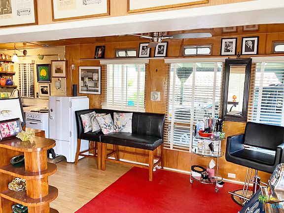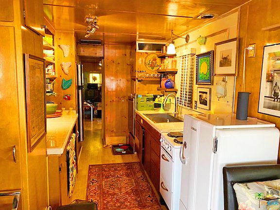 Vintage fabulous, appears to be original, 1955 Fleetwood with all the modern conveniences located in Twin Palms area, considered to be the best part of the south end of Palm Springs. Sahara Park is a senior park under rent control. Two bedrooms, two bathrooms, 4 ceiling fans, laminate flooring throughout and newer split system A/C and heat and expansive living room. Master bedroom is en-suite and has newer paneling on the ceiling with insulation as does the living room ceiling. The galley kitchen has a window pass through to the living room, range, oven, refrigerator, and what looks like it could be the original paneling. Washer and dryer hookups are outside at the end of the fabulous covered large carport. Big side yard and back patio for your enjoyment. It just doesn't get better than this. Park amenities: Pool, spa, clubhouse with full kitchen, meeting room, stage, card room, TV room, exercise room, ceramic studio and library.