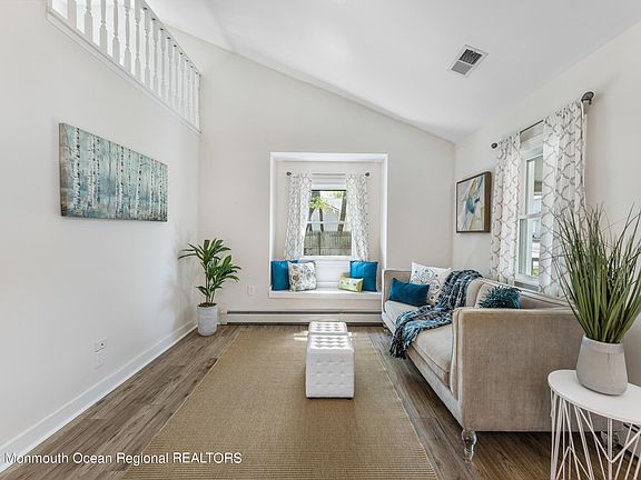 Three bedrooms, two full baths, including a primary suite with spacious closet. An office/den provides additional flex space for working from home. The two story vaulted ceilings in the living room and dining room add character to these areas. An inviting fireplace in the dining room and cozy window seat in the living room completes the open concept atmosphere. The fully finished basement with walkout Bilco doors offers extra recreational space or storage options as well as laundry facilities and a full bath with tub. The entire home features laminate flooring for easy upkeep and maintenance.
