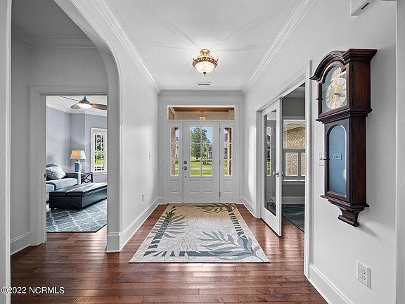 What a beautiful home located in prestigious North Shore Golf & Ocean Club. This home was custom built in 2013 with 4 bedrooms and 3 full baths and has a total of 3240 heated sq. ft. including, primary and separate. It is constructed of brick and hardie board. As you enter the foyer there is a bonus room to the right that can be used for an office, craft room, etc. On the left is another bonus room. As you continue, a full bath is on your right with a tiled walk-in shower. Next you will find the master suite on the right with a walk-in custom designed closet. There is a master bath with 2 separate vanities and a large walk-in tiled shower. You will see an entry to the sunroom with a vaulted wood ceiling and tile floor for the separate 444 sq. ft. with all walls and ceiling insulated. This room has gas logs and is cooled by a split air conditioner. Great room for a pool table, entertaining, TV room, etc. The kitchen is equipped with a double oven, quartz counter tops, pull out cabinet shelves, a large island and a 6 x 8 pantry. The dining area is straight across from the kitchen with windows and glass doors with easy access to the deck and a beautiful view of the backyard. This deck also has a remote-controlled awning that covers most of the deck. What a great place for morning coffee and enjoying the backyard nature. There are two other bedrooms with a Jack and Jill bath. This home also includes a laundry room large enough accommodate a freeze and a sink. This home has lots of upgrades and custom features. You can keep you lawn green with the irrigation system. The Rain Bird that runs the irrigation system around 1 year old. You must see this home to truly appreciate all that it has to offer. Location is great as it is located just minutes to beach and public boat ramp with immediate access to ICWW. Camp Lejeune base entrances are just a few miles away.