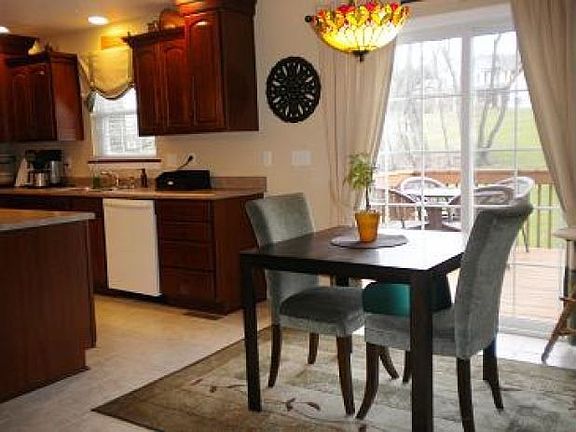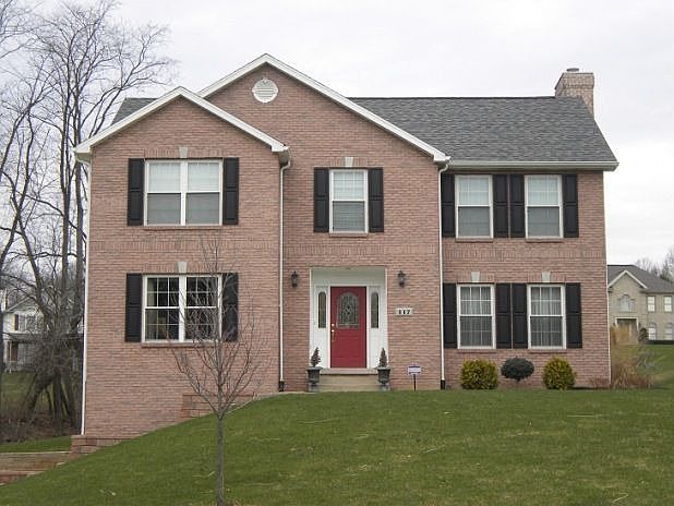 This brick face beauty features 4 bedrooms, 2 1/2 baths 7 3 car garage. Enter this home through etched glass doors with 2 etched glass sidelights & into spacious & impressive two story ceramic foyer. The turned staircase with exposed wood treads & 9' ceilings throughout 1st floor create an elegant feel. Formal living room, now used as office, has double windows. Formal dining room also has double windows, crown molding & upscale fixture. Powder room features cherry furniture style granite top vanity with oiled bronze fixtures. Center island kitchen boast breakfast bar, ceramic tile, custom cherry cabinets, desk area, double ovens, an abundance of recessed lights, large pantry & nook with sliders to deck. Family room open to kitchen has frizae carpet, stone raised hearth floor to ceiling fireplace & double windows. Upstairs find four very spacious bedrooms. The spacious master suite features ceramic surround whirlpool, separate shower, large cherry vanity with solid surface top, dressing table & huge walk in. Three other bedrooms all have Hunter Douglas fans & custom pleated shades. The lower level is plumbed for a future bath. The concrete drive is totally level & has an extra parking pad. This home also includes security system, lots of storage, 1st floor laundry & 1 year home warranty.