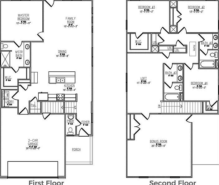 The WREN is a two-story floorplan with ample living space, featuring four bedrooms and three and a half baths. The first floor is an open concept space including the kitchen, dining, living room, laundry room, and spacious primary bedroom, which includes a large walk-in closet and bath with double vanities. The second floor opens to a versatile loft space, three secondary bedrooms, two bathrooms, and a bonus room. Photos are a depiction of a similar home.