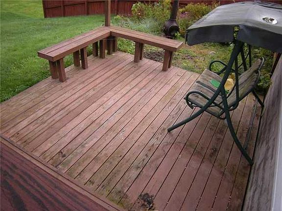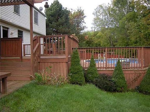 Earn some sweat equity, nice value with all the perks! Central air,wood stove,private back yard,master bedroom entrance to bath, Cool decking overlooks pool ,shed, playset. Some appliances, home sold as-is.