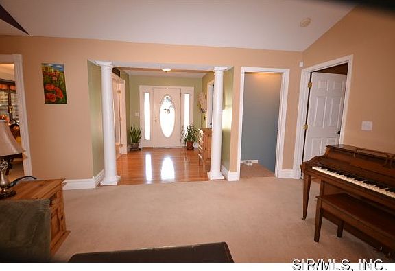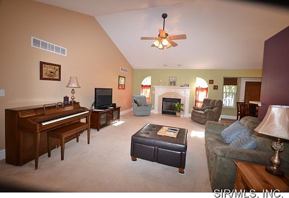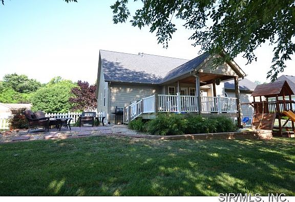 The perfect size split 3 bedroom floor plan with an open feel! You will instantly feel welcome as you enter the hardwood entry foyer. Vaulted great room with fireplace opens to a casual dining area and spacious kitchen. Formal Dining room with architectural dental crown molding and French doors. The kitchen boasts lots of cabinets, plenty of counter space including a serving bar & pantry. All newer kitchen appliances stay. Very spacious master suite with a huge walk-in closet. Huge Updated master bathroom with jetted tub, separate shower and double vanity. Look Out finished lower level features a large family room with built-ins, serving bar, office, half bath and a flex bonus room. Entertain on the covered deck with cabana fan. Additional open deck w/terrific paver patio and fenced yard. Move-In Perfect with todayâs decorating colors and touches. Great location near interstate access, shopping, dining and an easy commute to Scott AFB and downtown St. Louis