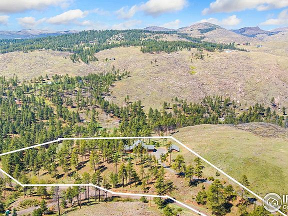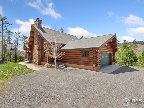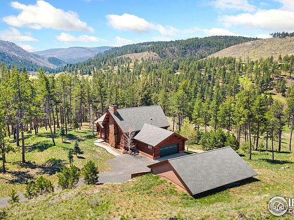 This breathtaking log cabin sits on nearly 7 acres of pristine land, where the only sounds you'll hear are the rustling wind through the pines and the melodies of local wildlife. This is mountain living at its finest-peaceful and surrounded by Colorado's beauty. Designed for relaxation, this home combines timeless architecture with modern amenities, making it the perfect escape from the hustle and bustle. The spacious floor plan has soaring high ceilings and exposed wood beams that reflect the artistry of nature itself. Every corner has been meticulously maintained as well, with numerous improvements throughout. A custom gas fireplace crafted with artisanal skill stands as a captivating centerpiece in the living area, casting a warm and inviting ambiance on colder evenings. The kitchen, equipped with Viking appliances, granite counters, and ample prep space, ensures that culinary endeavors are both enjoyable and effortless. The main floor primary suite features its own fireplace, a spa-like ensuite bath, a walk-in closet, and a private deck to soak in the crisp mountain air. Upstairs, another bedroom suite offers its own bath and a larger private deck, providing guests with panoramic views. The walk-out basement serves as the ultimate relaxation zone. A rustic stone fireplace creates the perfect atmosphere, while the kitchenette with matching stone bar and backsplash invites entertaining. This level also includes an additional bedroom and an office, offering versatility for guests or remote work. Take in fantastic Bronco sunsets and starlit nights while spotting diverse wildlife species from the comfort of your expansive wrap-around deck. With a 2-car attached garage plus a 896 sq ft detached garage/workshop, there's plenty of space for storage, hobbies, or extra vehicles. Enjoy mountain serenity while still being a short drive from shopping, dining, and entertainment, with Old Town amenities just 15 miles away.