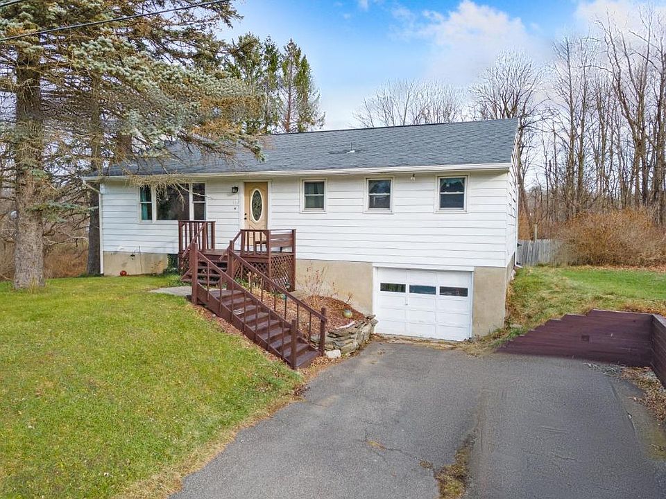 On the edge of Dryden Village/Town, this sweet 3 bedroom raised ranch offers move-in condition with a modern flair including an open design between living room & large eat-in kitchen. You'll love the stone fireplace with electric insert for warm vibes radiating into main spaces! Afternoon light floods the living room through the big picture window. Many new updates - list available upon request. 2 of 3 bedrooms are large, with hardwood floors and an updated full bath on the South wing of the home. SE bedroom has slider doors to newer composite back deck. There's also a cozy covered upper back deck off kitchen. Full unfinished walk-out basement has plenty of room for storage, laundry and possible rec room. 1-car garage under with newly insulated ceiling. Don't miss the side yard near the Jim Schug/Dryden Lake trail, a bonus wooded area (Village lot). Easy commute to Syracuse, Cortland or Ithaca to Route 13 -> Route 81 corridor. Affordable, adorable and ready for new owners to enjoy!
