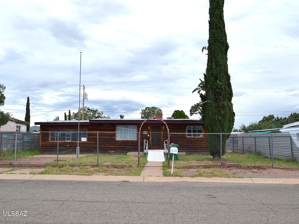 Larger home in the Huachuca Vista subdivision with private fully fenced yard with chain link and Metal corrugated panels. This home offers 2 bedrooms, 1 bathroom, two living areas, kitchen and a laundry room. There is a metal ramp to the front door for easy access. The main roof is metal, with shingles on the back awning. With a little TLC, this could be your perfect home.
