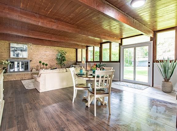 About $90K spend on this newly renovated ranch home located right by Crystal Lake offering gorgeous open floor plan, exposed brick and beams, large windows, and modern touches! Gorgeous low-maintenance wood laminate floors throughout! Entertain in grand style in the open living and dining spaces presenting fireplace and patio access! Overlooking the living and dining room is the updated gourmet kitchen boasting new stainless steel appliances, white cabinets, and quartz countertops. Retreat away to the master suite graced with a large walk-in closet and private ensuite with walk-in shower and double sink vanities! Two additional bedrooms and a shared bath complete the home. Spacious and open yard is perfect for enjoying outdoor activities or spend the day out on Crystal Lake! Located right off Route 14 and just a short distance from Lippold Park and Hound Town Dog Park! Welcome home!