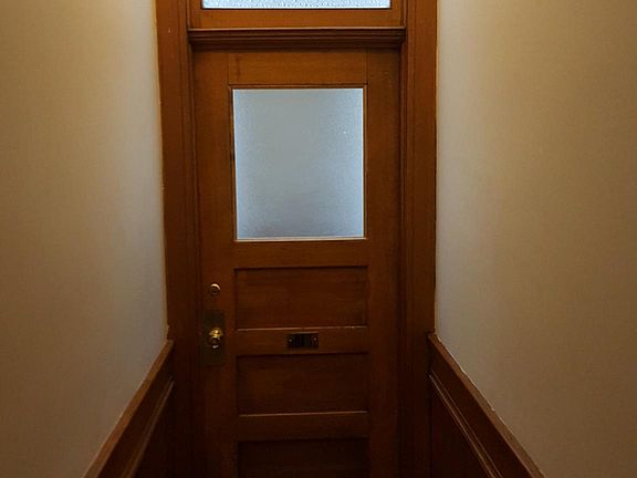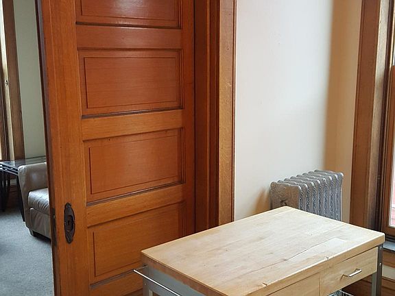 BIG living room with lovely golden oak trim and POCKET DOORS between living room and kitchen; nice views and great light; HUGE bedroom with TWO walk-in closets.