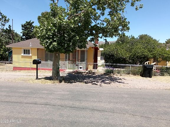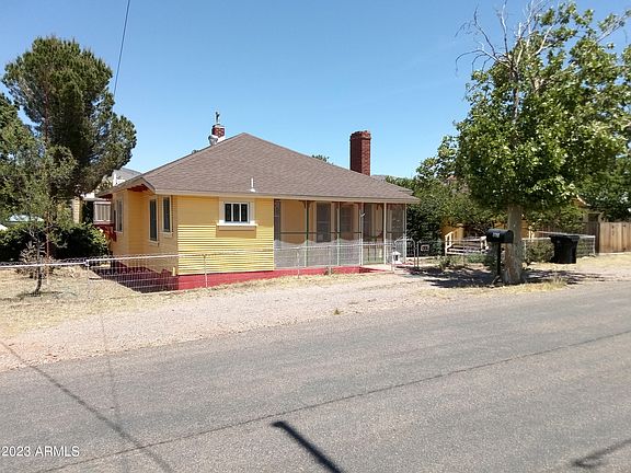 1908 Arts & Crafts bungalow, front bath has a shower; larger back bath has the original claw-foot tub. Both have been completely remodeled with new tile work and period light fixtures. The kitchen has new granite counter tops and tile floor. The kitchen and pantry offer ample shelf and cupboard space with built-in spice rack. 1940s gas stove and 1960's Fridge. Bright laundry room offers washer, drier, additional cabinet space, and a granite-topped corner bookcase. Both the living and dining rooms have built in cabinets. The master bedroom features a wall of built in cabinets and a murphy bed. It connects to a large master bath and a sizeable walk-in closet. The smaller front bedroom has a built-in bookcase and closet. The house has screened-in front porch. New ¾ inch hardwood oak flooring, and closet has original hardwood floor. The home was built in the beginning of the Warren subdivision of Bisbee. The entire house has been carefully restored with period lighting and beautiful trim and crown molding throughout. The wooden double hung windows are from the period. The front door is from a 1910 home in Canada. The wood siding on the house is the original Edwardian "ogee" from 1908. The former single car garage built in 1935 is now a 225 sq. ft. tiled living space. It has two double sets of French doors and a third door exiting to a landing and stairs. These lead to an outdoor tiled area. One set of French doors leads to a terrace connected to the main house.